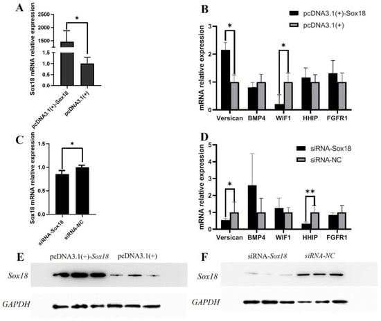 Effect of Sox18 on the induction ability of DPCs. (A–D) The relative mRNA expression of Sox18, Versican, BMP4, WIF1, HHIP and FGFRI. (E,F) Detection of Sox18 protein expression levels. “*” indicates a significant difference (p < 0.05) and “**” indicates a highly significant difference (p < 0.01).