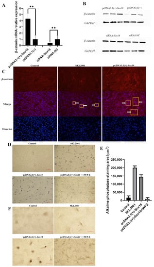 The Wnt/β-catenin signal pathway is closely related to the growth and development of hair follicles. The results of RT-PCR and WB revealed that the expression of β-catenin was significantly changed in DPCs when Sox18 was overexpressed or interfered with (Figure 5A,B). We speculated that Sox18 regulated the induction ability of DPCs through the Wnt/β-catenin signal pathway. SKL2001 was used to activate the Wnt/β-catenin signal pathway of DPCs []. After the Wnt/β-catenin pathway signal of DPCs had been activated, the amount of β-catenin expressed in the nucleus of DPCs increased (Figure 5C). When Sox18 was overexpressed in DPCs, the amount of β-catenin expressed in the nucleus of DPCs also increased, indicating that Sox18 activated the Wnt/β-catenin signal pathway of DPCs (Figure 5C). Further study found that the alkaline phosphatase activity of DPCs was enhanced when Sox18 was overexpressed in DPCs, which was the same as when the Wnt/β-catenin signal pathway was activated (Figure 5D,E). However, the positive effect of Sox18 on the alkaline phosphatase activity of DPCs was aborted when we added IWP-2, an inhibitor of the Wnt/β-catenin signal pathway [], to DPCs overexpressing Sox18 (Figure 5D,E). Therefore, we believe that the Wnt/β-catenin signal pathway was closely related to the induction ability of DPCs. It was further observed that overexpressed Sox18 as well as activation of the Wnt/β-catenin signal pathway in DPCs enhanced the agglutination of DPCs, while inhibition of the Wnt/β-catenin signal pathway weakened the effect of Sox18 on the agglutination of DPCs (Figure 5F). This further suggested that Sox18 regulated the induction ability of DPCs through the Wnt/β-catenin signal pathway. To sum up, Sox18 activated the Wnt/β-catenin signal pathway in DPCs, thus enhancing the induction ability of DPCs.