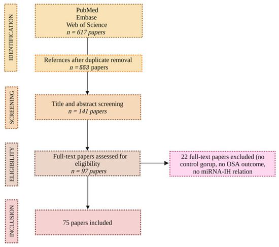 Two investigators (G.M. and P.S.) independently screened all references for inclusion, and discrepancies were resolved by discussion among the team. Eligibility was considered for items that had a control group, exhibited results with OSA, and showed a relationship between miRNA and IH. No language restrictions were applied. The full texts of all studies referring to OSA, IH, miRNA, and cancer were reviewed for final inclusion.