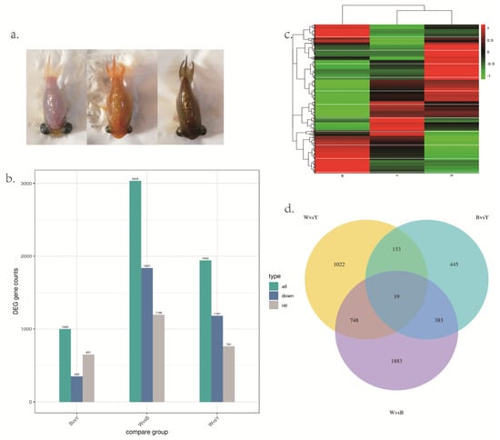 (a). The different skin colors in the celestial goldfish. Left: white (W); center: yellow (Y); right: brown (B). (b) The bar graph of number of DEGs among three different skin colors. (c) Clustering heat map of DEGs in the three skin color groups. (d) DEGs number and Venn diagram of the overlap of the different skin color groups. W: white; Y: yellow; B: brown.