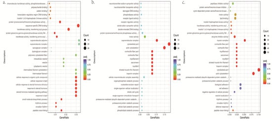 (a). The scatter figure of GO enrichment in white vs. yellow. (b) The scatter figure of GO enrichment of DEGs in brown vs. yellow. (c) The scatter figure of GO enrichment of DEGs in white vs. brown. Count: number of genes in each pathway. GeneRatio: ratio of the number of target genes divided by the total number of genes in each pathway.