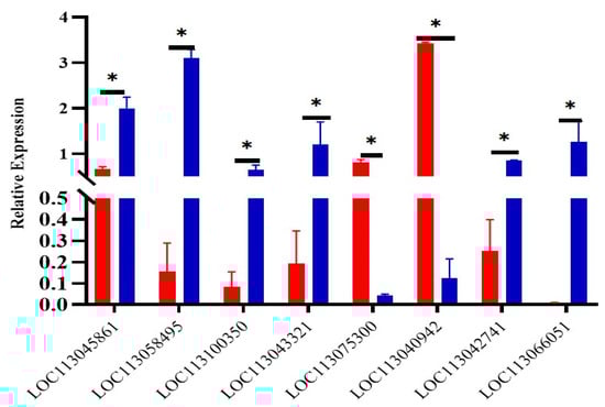 The expression levels of mRNA verified by qPCR. LOC113045861-LOC113043321: left: yellow group, right: brown group; LOC113075300: left: white group, right: brown group; LOC113040942-LOC113066051: left: yellow group, right: white group. * indicates p < 0.05.