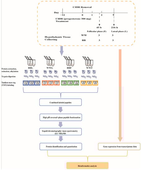 Sample grouping information overview of processing. Based on FecB genotypes, six STH ewes with the wild genotype (WW) and six FecB mutant homozygous (BB) were treated with controlled internal drug release (CIDR). After 12 days, the CIDR was removed from the ewes while the CIDR withdrawal time was recorded as 0 h. Hypothalamus tissue was collected from three WW ewes and three BB ewes euthanized at 45 h (follicular phase) (WWF, BBF). Subsequently, from three WW ewes and three BB ewes euthanized at 216 h (luteal phase) (WWL, BBL). The TMT quantitative proteomics analysis was employed to identify changes in the abundance of protein in hypothalamus tissues. Finally, bioinformatics analysis was performed in combination with downloaded transcriptomic data from the same samples.
