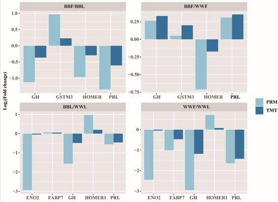 On the basis of the abundance of proteins in different groups in the TMT analysis, we randomly selected some important genes to validate the TMT results using the PRM method. In the BBF vs BBL and BBF vs WWF groups, prolactin (PRL), growth hormone (GH), homer scaffold protein 1(HOMER1) and glutathione S-transferase mu 3 (GSTM3) were selected for the analysis and the log2Fold change (log2FC) values were calculated in the WWF vs WWL and BBL vs WWL groups, PRL, GH, HOMER1, fatty acid binding protein 7 (FABP7) and enolase 2 (ENO2) were selected for the analysis, and the log2FC values were calculated. We found that the PRM results of these selected genes showed the same trends in directional abundance (up and down) as the TMT results in the different groups (Figure 2 and Supplementary Table S3).