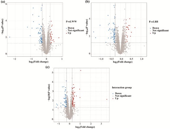 Volcano plots of DAPs. Using a foldchange >1.2 or <0.83, p value < 0.05 as the threshold, the upregulated and downregulated DAPs are shown separately in the FvsLWW group (a), the FvsLBB group (b) and the interaction group (c). FvsLWW: follicular phase relative to the luteal phase in sheep with WW genotype; FvsLBB: follicular phase relative to the luteal phase in BB sheep; Interaction: which proteins respond differently in BB compared to WW sheep.