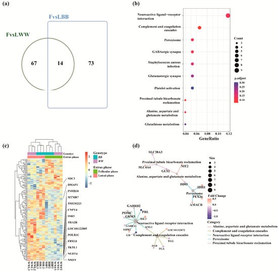Analysis of DAPs. (a) Venn plot displaying the overlap of DAPs between the FvsLWW and FvsLBB groups. (b) Dotplot of the top 10 KEGG enrichment terms for DAPs concatenations in the FvsLWW and FvsLBB groups. pAdjust: false discovery rate (FDR). (c) Hierarchical cluster of DAPs in the FvsLWW and FvsLBB groups in which all of the abundance values of proteins were normalized and scaled. (d) Networks of the top 10 KEGG enrichment terms were visualized by cnetplot. FvsLWW: follicular phase relative to the luteal phase in WW sheep; FvsLBB: follicular phase relative to the luteal phase in BB sheep.