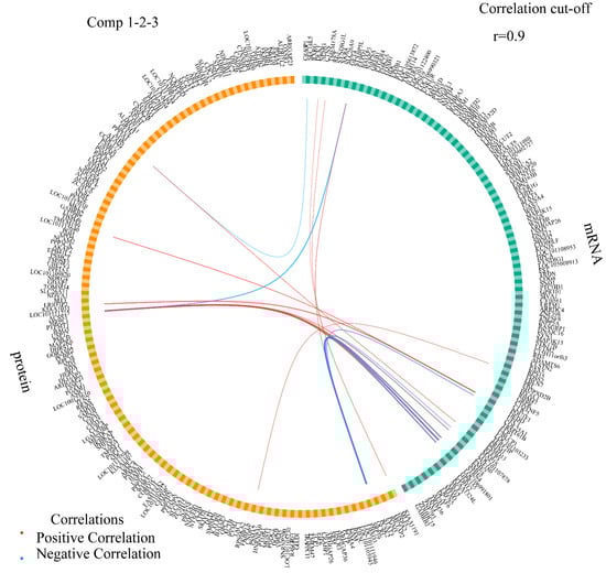 Quantitative proteomic analysis experiments do not provide a comprehensive profile of biological regulatory networks []. Studies have been conducted to combine proteomic and transcriptomic data from the same sample to screen for valuable breeding genes [,]. In previous studies, the correlation between transcriptome and proteome data was poor owing to post-transcriptional regulation and post-translational modifications as well as experimental technical errors [,]. In general, mRNA splicing, changes in protein turnover and protein degradation may result in a weak correlation between the expression pattern of mRNA and the abundance of its translated proteins in tissues []. In multi-omics integration, mRNA expression and protein abundance data (p data points) are usually much more than the achievable sample size (n samples). In this study, to address the p ≫ n problem, we reduced the complexity of the data by selecting a subset of variables (DIABLO) []. Overall, our integration of two biological data types, proteomic and transcriptomic, provided greatly enhanced, powerful biological insights.