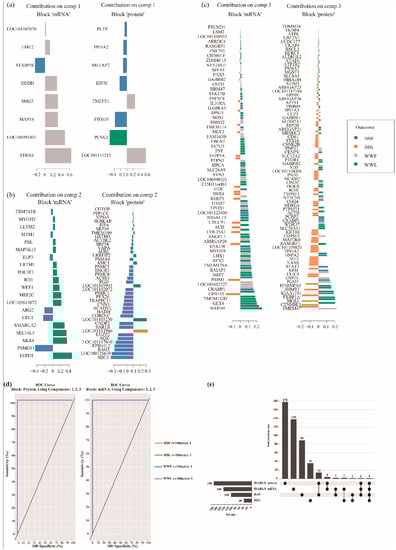 Targeted protein and mRNA panel and classification performance. DIABLO predicted the importance of multi-omics biomarkers, which were calculated on the basis of the absolute value of the loading vector weights shown for each block (protein and mRNA) and each component (component 1 (a), 2 (b), 3 (c)). Each biomarker is color-coded according to its association with genotype and estrous stage. (d) Receiver operating characteristic area under the curve (ROC AUC) provides results of 1.00 separately using mRNAs and proteins from the three components in the classifier model. (e) Overlap between biomarker panels identified using DIABLO and traditional single-omic multivariate approaches. This upset plot was plotted using the online tool ChiPlot (https://www.chiplot.online/ (accessed on 1 November 2022)). BBF: sheep with BB genotype in the follicular phase, BBL: sheep with BB genotype in the luteal phase, WWF: sheep with WW genotype in the follicular phase, WWL: sheep with WW genotype in the luteal phase.