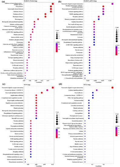 Top 30 enriched KEGG pathways of DAPs and DEGs of the interaction group and discriminating variables (DIABLO_protein, DIABLO_mRNA) selected by DIABLO. (a) KEGG enrichment pathways for DIABLO_protein group. (b) KEGG enrichment pathways for DIABLO_gene group. (c) KEGG enrichment pathways for DAPs of interaction group. (d) KEGG enrichment pathways for DEGs of interaction group.