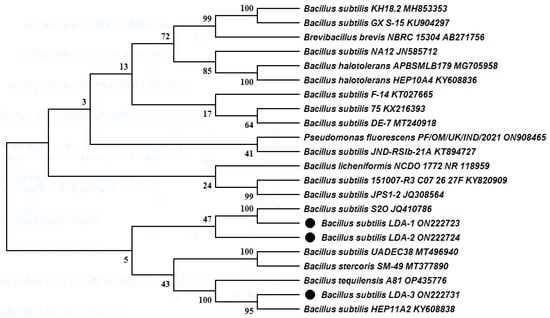 Neighbor-joining phylogenetic tree (values at branching points indicate bootstrap) based on 16S rDNA sequences of isolated Bacillus subtilis strains LDA-1, LDA-2, and LDA-3. (bootstrap values expressed as percentages of 1000 replications).