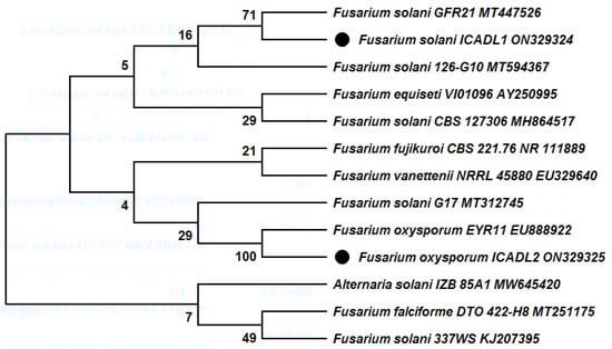 Two phytopathogen fungal strains were isolated from alfalfa and cotton roots and identified based on ITS sequences. The amplification of the ITS region was successfully performed and the sequence data were used for the BLAST search in the NCBI database. The BLAST search revealed that the two isolated fungal strains are members of the genus Fusarium. The ITS sequences were aligned with the available sequences in the NCBI database to construct the phylogenetic tree based on ITS sequences by the neighbor-joining (N-J) method. The phylogenetic tree revealed that the first strain exhibited similarity (71%) to Fusarium solani strain GFR21(MT447526), while the second strain was most relative to Fusarium oxysporum strain EYR11 (EU888922) with 100% similarity (Figure 2). Therefore, the two isolated fungal strains were identified and recorded in GenBank as Fusarium solani strain ICADL1 (ON329324) and Fusarium oxysporum strain ICADL2 (ON329325), respectively.