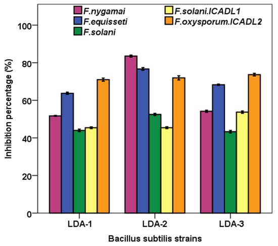 The three bacterial strains (LDA-1, LDA-2, and LDA-3) significantly (p < 0.05) suppressed the radial fungal growth of Fusarium strains, namely F. nygamai, F. equisseti, F. solani, F. solani ICADL1, and F. oxysporum ICADL2 in dual cultures compared to controls without bacteria after 6 days of incubation (Figure 4). The inhibitory effect of antagonistic bacterial strains against fungi was varied from 43.3 to 83.5% growth inhibition. The means comparison of the inhibitory effect of all bacterial strains on the mycelial growth of each fungus revealed that the maximum inhibition (83.5 ± 0.53%) was obtained with B. subtilis LDA-2 against F. nygamai. In contrast, the lowest inhibition percent (43.3% ± 0.69) was observed on F. solani when treated with B. subtilis LDA-3.