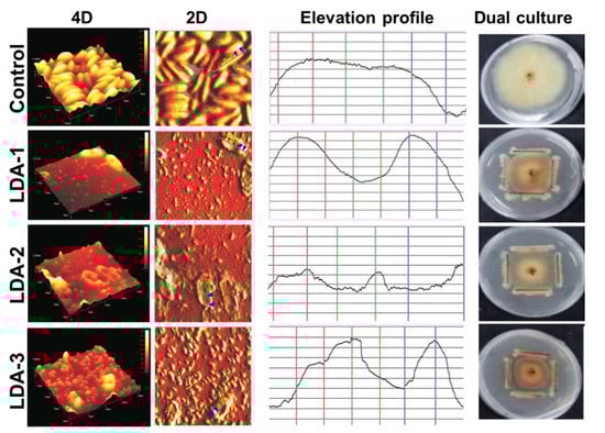 Atomic force microscopy (AFM) images of F. solani strain ICADL1 treated by B. subtilis strains LDA-1, LDA-2, and LDA-3 illustrating the effect of antagonistic B. subtilis strains on cell wall topography of mycelia of F. solani ICADL1. The red, green, and blue arrows of the 2D view images correspond to the points outlined in the elevation profile.