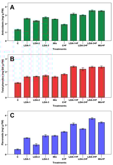 Effect of B. subtilis strains (LDA-1, LDA-2, and LDA-3) on antioxidants (A), phenolic content (B), and flavonoids (C) of cotton seedlings infested by F. solani ICADL1. C = control, F = F. solani ICADL1. The data are presented as means of three replicates, ± standard error (SE).