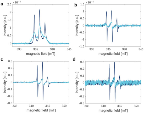 Comparison of the sensitivity of RS and CW EPR experiments. Dark blue spectra correspond to aS A27C-MTSSL monomer sample, whereas light blue spectra show aS in fibrils. (a) Absorption spectra recorded by RS EPR spectroscopy were accumulated for 1 min. (b) Pseudo-modulated RS EPR spectra from (a) modulated with 0.1 mT. (c) CW EPR spectra after 30 min of acquisition and averaging. (d) CW EPR spectra represent accumulation for 1 min. Field modulation in CW (c,d) results in the detection of the first derivative of the absorption spectrum.
