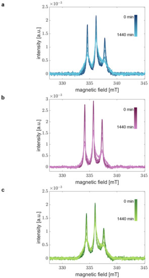 Samples with a volume of 20 µL were filled in glass capillaries (HIRSCHMANN® ringcaps®, inner diameter 1.02 mm, Eberstadt, Germany) and sealed with Hemato-Seal™ capillary sealant (Fischer-brand™, Schwerte, Germany). RS spectra were recorded on an Elexsys 500 spectrometer (Bruker, Karlsruhe, Germany) equipped with the Rapid-Scan Accessory (Bruker, Karlsruhe, Germany) [40] at X-band frequency (9.426 GHz). Sinusoidal rapid magnetic-field scans at a frequency of 20 kHz with a scan width of 20 mT were applied using a 1D field experiment. The center field was set to 336.4 mT, the attenuation to 20 dB (2 mW power), and the background correction function TwoTone included in the XEpr software (Bruker) was chosen. The measurement time was set to 60 s resulting in averaging of 1,202,643 scans (63,297 onboard averages, 19 off-board averages). Recorded spectra were processed with Matlab R2019b (The Mathworks, Inc., Natick, MA, USA) and the toolbox EasySpin 6.00 [41]. Processing included baseline correction, adjusting the field position of the spectra to correct for small deviations in the microwave frequency between different samples, smoothing of data with a Savitzky–Golay filter function, and the normalization of the intensity.
