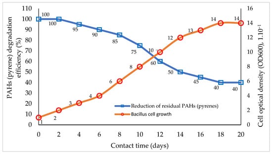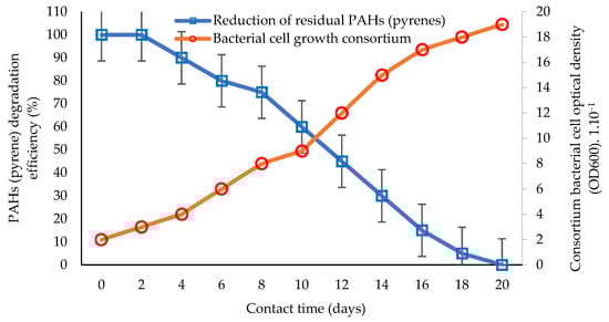 Comparison of the percentage of PAH (pyrene) bioremediation with bacterial cell growth rates based on interaction time. Graphically modified figure [,,,,].
