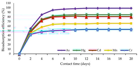 The analysis of the bioremediation pattern of marine sponge symbiont bacteria against several kinds of heavy metals showed that the optimal adsorption of heavy metal pollutants by bacteria generally occurred at a contact duration of 2–6 days or when the bacteria had passed the adaptation phase in a new environment exposed to heavy metal toxins [,]. Bacterial remediation activity decreased until it reached a contact time of 20 days. This biosorption pattern is illustrated in Figure 3.