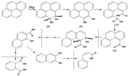 The application of hydrocarbonoclastic bacteria (R-1) in the biodegradation of PAHs is one of the modifications that is considered to improve the performance and efficiency of bioremediation [,]. Several types of bacteria can be used, for example, Bacillus pumilus, Pseudomonas stutzeri and Acinetobacter calcoaceticus [,], all of which can biodegrade PAHs (hydrocarbonoclastic bacteria) [,]. These bacteria were formulated as a consortium bacterial suspension and interacted with pollutant PAHs, e.g., pyrene (Figure 6) [,].