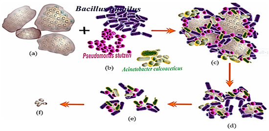 Description of the biodegradation process of PAH (pyrene) contaminants using one type of bacteria, Bacillus pumilus type. (a) Pyrene as a substrate; (b) Bacillus pumilus (Bp); (c) pyrene-Bp complex; (d) Degraded pyrene; (e) The population of Bp was significantly reduced and the pyrene concentration was not significantly reduced and (f) the remaining pyrene was not degraded, an illustration [,,,].