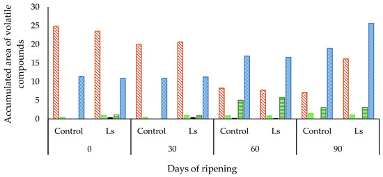 A total of 52 volatile compounds were identified throughout the ripening time in the two different batches of “salchichón” (Table 1 and Table 2). Most of these compounds have previously been reported in different types of dry-cured fermented sausages [12,13,14]. These volatile compounds were classified according to their most probable origin as from lipid oxidation (25), microbial esterification (3), carbohydrate fermentation (1), amino acid catabolism (6), and spices (13), and exposed as the summation of the accumulated area of these groups in Figure 1. However, some of the compounds could have more than one source or they are derived from secondary reactions between substances generated in different catabolic routes [15]. When the accumulated area of these groups of compounds was analyzed, it was observed that levels of those derived from lipid oxidation showed a decrease throughout the ripening time in both Control and inoculated batches in comparison with day 0 levels (Figure 1). However, the accumulated area of compounds derived from amino acid catabolism and spices increased throughout the ripening time in the Ls batch, showing the highest mean values at day 60 (derived from amino acid catabolism) and at day 90 of ripening (derived from species). Compounds derived from microbial esterification showed the highest levels in both analyzed batches at day 90 of ripening (Figure 1).
