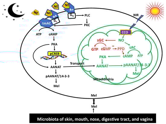 The differentially regulated melatonin synthetic pathway in cytosol, mitochondria, and microbiota. In the pineal, NE, which represents the dark message, acts on the Aβ and Aα membrane receptors to activate the tmAC to generate cytosolic cAMP, which is mitochondria impermeable. NIR is associated with sun exposure and acts mainly on the mitochondrial sAC to increase the mitochondrial cAMP, which in situ phosphorylates the AANTT at the posttranslational level. This model assumed an activation of sAC by NO, which would require further confirmation. In addition, NO activates sGC to increase cGMP, which can inhibit the phosphodiesterase to reduce cAMP degradation and further increases the mitochondria cAMP content. The posttranslational regulation of AANAT activity quickly increases the melatonin synthesis, as seen in extrapineal cells. The regulatory mechanisms of melatonin synthesis in microbiota are currently unknown, but it is hypothesized there is a reciprocal effect between the melatonin produced by the host and microbiota. NE: norepinephrine, Aβ: β adrenergic receptor, Aα: α adrenergic receptor, Gs: stimulatory G protein, Gq: G protein q subunit, tmAC: transmembrane adenylyl cyclase, sAC: soluble adenylyl cyclase, sGC: soluble Guanyl cyclase, PPD: phosphodiesterase, PLC: phospholipase C, PKC: protein kinase C, PKA: protein kinase A, AANAT: arylalkylamine acetyltransferase, pAANAT: phosphorylated AANAT, NO: nitric oxide, CCO: cytochrome C oxidase (mitochondrial complex IV), 14-3-3: 14-3-3 protein, Mel: melatonin.