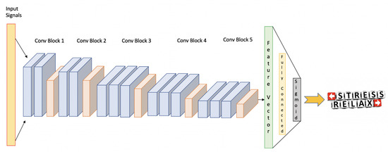 We built a multidimensional CNN model, comprised of the three physiological parameters and one dense layer to develop the probability values of each stress category from the output signals. This allowed us to automatically learn the stress-relevant features of the three types of physiological signals. The Cont-RPs of each type of signal were provided as inputs for each CNN during training. To acquire the inherent features present in the Cont-RPs of the FGSR, HGSR, and HR signals, three CNNs have been used. The process is broken down into three different stages: first, starting to learn reflective feature space using the multiple CNNs through the Cont-RPs of the three frequency varieties; second, incorporating their symmetrical outputs into one incorporated recognition variable; and third, creating class probabilities based on the representation vectors by learning the relationships between them using a fully-connected layer including a nonlinear function. Although our CNNs feature the same structure as the initial portion of the VGG16 model [51], many of the parameters were trained from scratch using the training dataset. Figure 2 shows the overview of the presented CNN framework. To put it another way, each CNN was made up of five convolution blocks, each of which had a two-dimensional inversion, a rectified linear unit (ReLU) activation, and a max pooling layer. Two fully connected layers were present in the first two convolution blocks (ConvBlocks 1 and 2), however, three convolution layers were added to the subsequent blocks. Additionally, all fully connected layers were processed using 3 × 3 filters with a stride of 1, and the max pooling layer was processed using 2 × 2 filters with a stride of two. While pooling layers minimize the spatial component of extracted features, convolution layers learn spatial information and extract features using kernels with sliding window strategies. The resulting three feature maps were flattened (i.e., three vectors with a dimension of 256) and concatenated within one consolidated depiction vector with a size of 768 after passing along through the fifth convolution block in each CNN. Each variable was then supplied to the dense layer, as well as the output layer’s perceptron was the nonlinear function, which was used to forecast the probabilities of the two classes (the stressful and relaxing states).