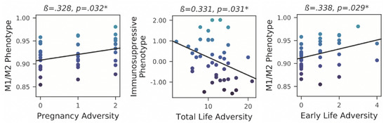 Adversity at vulnerable times and mental health symptoms have both single-factor and multiple-factor associations with the M1/M2 phenotype.