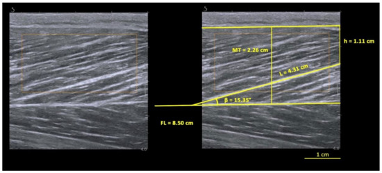 where L is the observable fascicle length from the mid-muscle aponeurosis to the most visible endpoint, h is the perpendicular distance between the superficial aponeurosis and the fascicle’s visible distal end-point and β is the angle between the fascicle (drawn linearly to the most distal point) and the superficial aponeurosis, as in Figure 1. The MT was measured as the distance between the superficial and the mid-muscle aponeurosis measured at the ROI site. For each condition, two videos were recorded, and a frame was selected from each video. This was conducted in pre- and post-task instants (totaling 8 images for each limb). Three fascicles were selected in each image, meeting the criterion that a reasonable portion of the fascicle (~25% or more of the total estimated length) must have been visible within the ultrasound transducer’s field of view to be included in the present study [31].