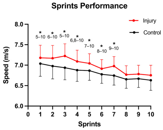 Acute effects of a sprint protocol on the average maximal speed injured players vs. healthy controls. Data are presented as mean ± standard deviation. * Significant difference between the current sprint and each subsequent sprint indicated.