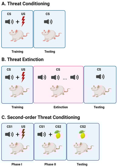 - Lingawi, N.W.; Laurent, V.; Westbrook, R.F.; Holmes, N.M. Acquisition and extinction of second-order context conditioned fear: Role of the amygdala. Neurobiol. Learn. Mem. 2021, 183, 107485. [Google Scholar] [CrossRef] [PubMed]