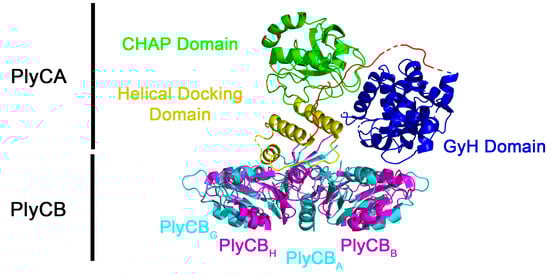 The structure of PlyC has a novel multimeric composition []. Contrary to the conventional protein architecture for endolysins that target Gram-positive bacteria, which generally consist of a single polypeptide with a conserved N-terminal catalytic domain linked to a variable C-terminal cell wall binding domain (CBD), the PlyC holoenzyme collectively consists of nine subunits (Figure 1). The CBD comprises eight identical PlyCB monomers that interact through protein–protein interactions to form an octameric ring structure []. The PlyCB CBD was recently shown to bind with high affinity and avidity to a polyrhamnose moiety shared in the wall teichoic acids of sensitive streptococcal species []. The ninth subunit, PlyCA, is the catalytic subunit consisting of an N-terminal glycosyl hydrolase (GyH) domain, a central helical docking domain, and a C-terminal cysteine, histidine-dependent amidohydrolase/peptidase (CHAP) domain. The GyH and CHAP domains act together synergistically to generate the robust bacteriolytic activity of PlyC, whereas the central helical docking domain of PlyCA interacts with the PlyCB CBD to form the holoenzyme structure [].