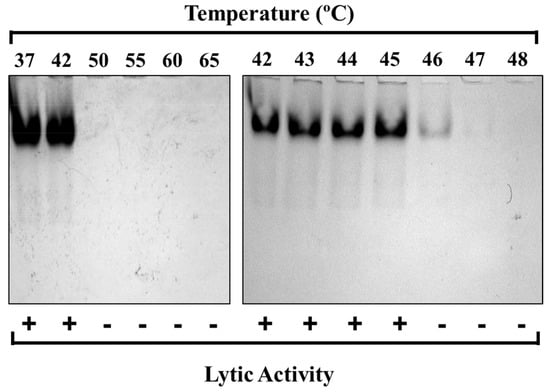 Short-term heating experiments were utilized next to identify the precise temperature at which PlyC is thermally denatured. For these studies, the thermal stability of the PlyC holoenzyme structure was first examined by incubating equal molar concentrations of the purified endolysin at temperatures ranging from 37 to 65 °C for 30 min, which was followed by rapid cooling and visual inspection using native PAGE (Figure 3). Results from the initial electrophoretic analysis suggest the structural conformation of PlyC is compromised between 42 and 50 °C, as evidenced by the inability of the aggregated sample to enter a native polyacrylamide gel (Figure 3, left). Next, fresh PlyC was heated from 42 to 48 °C in one-degree increments in order to determine the precise temperature at which the holoenzyme loses structural integrity. Native PAGE revealed PlyC loses electrophoretic mobility at 46 °C as a result of thermally induced aggregation (Figure 3, right). These observations directly correlate with a temperature-dependent loss of enzymatic activity toward S. pyogenes (Figure 3, bottom).