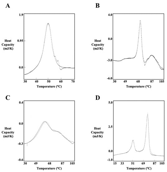 Differential scanning calorimetry (DSC) measurements were performed using a VP-DSC Microcalorimeter (MicroCal Inc., Los Angeles, CA, USA) under a static, oxidative atmosphere. The sample and reference vessels had an operational volume of 0.511 mL. Prior to sample analysis, PBS, pH 7.4, or 20 mM phosphate buffer, pH 7.4, was initially added to both the sample and reference vessels and subsequently subjected to two heating/cooling cycles from 15 to 105 °C and 105 to 15 °C using scan rates of either 15 or 60 K/h. The result from the second heating/cooling cycle was utilized as the baseline. Next, protein samples at various concentrations were independently injected into the sample vessel and subjected to multiple heating/cooling cycles. After subtraction of the baseline from the sample scan, the resulting raw data of the differential power as a function of time were divided by the scan rate to convert the data into heat capacity versus temperature. Utilizing the EXAM program [], two-state thermal transition models were fitted to the heat capacity versus temperature data to calculate the van’t Hoff enthalpy (∆HVH) from the shape of the transition peak. EXAM was also used to determine TG (the temperature at the thermal transition midpoint) and calorimetric enthalpy (∆Hcal; the area under the transition peak divided by the moles of protein in the sample cell) values.