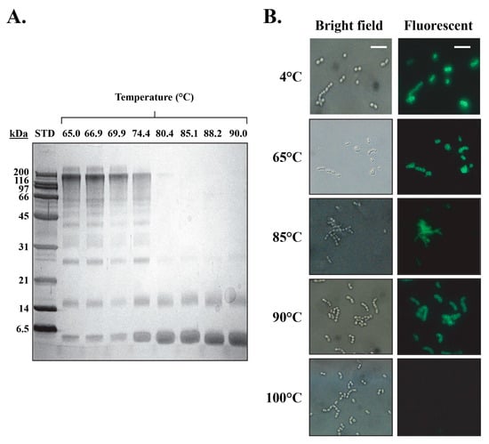 The organic dye, AlexaFluor™-555 (ThermoFisher Scientific), was conjugated to PlyCB according to the manufacturer’s instructions. Aliquots consisting of 100 µL of the conjugated protein at 1 mg/mL were incubated from 4 to 100 °C for 30 min in PBS using an EchoTherm™ refrigerated heat block and then immediately cooled on ice. Next, the protein samples (10 µL each) were incubated with S. pyogenes in PBS for 10 min at room temperature. The labeled cells were washed with PBS and viewed on a Nikon Eclipse 80i fluorescent microscope equipped with a Retiga 2000R camera using a Cy3 filter for fluorescence imaging.