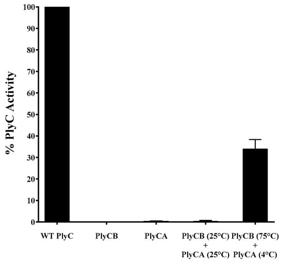 Thermal reconstitution of the PlyC holoenzyme. To elucidate the folding dynamics of PlyC, an attempt was made to reassemble the holoenzyme structure using purified PlyCA and PlyCB subunits. In one scenario, PlyCA and the PlyCB CBD were incubated at room temperature. Alternatively, ice-cold PlyCA was mixed with the PlyCB CBD in PBS heated to 75 °C and then immediately placed on ice. A 1:1 molar ratio of PlyCA:PlyCB CBD was used in both instances. Used as an indirect measure of PlyC holoenzyme reconstitution, the bacteriolytic activity of each sample at equal molar concentrations was assayed against S. pyogenes using a turbidity reduction assay. Activity was normalized to that of PlyC. Isolated PlyCA (<1% activity of PlyC) and PlyCB CBD (no activity) were used as controls.