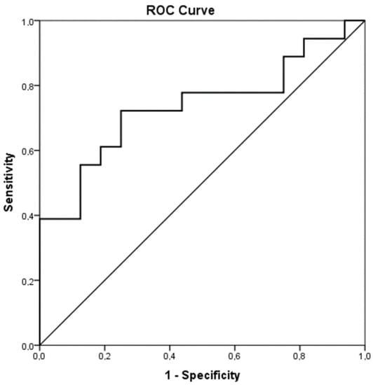 The hemostatic mechanism was considerably deranged in the acute phase of infection compared to the healthy controls. PT and APTT were prolonged in the infection group (acute phase) compared to the control group (15.2 ± 4.1 s vs. 11.9 ± 1.8 s, p = 0.014 and 33.1 ± 4.5 s vs. 29.5 ± 2.7 s, p = 0.040, respectively). What is more, levels of FII, FVII and PC were significantly decreased in the acute phase of infection compared to the controls (Table 2). FIX and AT were similarly more decreased in the infection group (acute phase) than in the controls, although the difference was not statistically significant. PS levels were almost equal between the infected neonates (acute phase) and the controls (Table 2). Contrarily, Fibrinogen, FVIII, VWF and Rcof were elevated in the infection group (acute phase) compared to controls and the difference was statistically significant. Interestingly, D-dimers were increased in the control group but not in the patient group, even though there was no statistically important discrepancy. ADAMTS-13 was decreased in the acute phase of infection in contrast to the controls (488.5 ± 75.4 ng/mL vs. 577.2 ± 113.6 ng/mL, p = 0.015). Figure 1 shows the ROC analysis of ADAMTS-13 as a predictor of infection (AUC = 0.736, CI95% 0.564–0.908, p = 0.019). The chosen cutoff value was 545.5 ng/mL, with sensitivity 72% and specificity 75%.