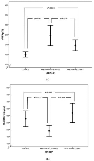 Comparison of VWF (a) and ADAMTS-13 (b) between controls, acute phase of infection and recovery.