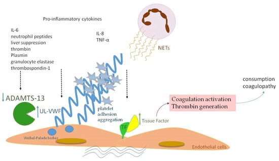 - Chen, J.; Chung, D.W. Inflammation, von Willebrand Factor, and ADAMTS13. Blood 2018, 132, 141–147. [Google Scholar] [CrossRef]