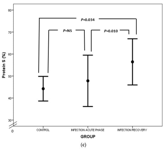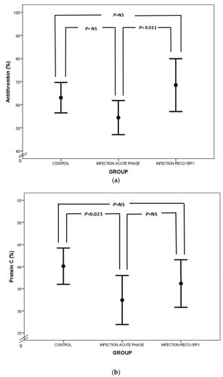Considering natural anticoagulants (AT, PC and PS) in neonatal sepsis, our study demonstrated a suppression of this anticlotting mechanism. In particular, AT levels were lower in neonates with sepsis than in healthy neonates (Figure 4a), which is in accordance with previous reports [,]. AT exerts its anticoagulant activity by neutralizing thrombin and activated FX (FXa) and to a lesser extent activated FIX and FVII (FIXa and FVIIa, respectively) []. Lower levels of AT in sepsis are attributed to AT consumption in the activated coagulation process, impaired liver synthesis and AT inactivation by neutrophil-induced elastase. Syndecan shedding also contributes to AT decrease in sepsis [,,]. Besides the net anticoagulant activity of AT, anti-inflammatory properties are also prominent. Endothelial prostacyclin, induced by AT, inhibits platelet aggregation and activation, neutrophil and blood vessel wall interaction, and cytokine production. Furthermore, direct interplay between AT, leukocytes and lymphocytes takes place, while AT inhibits thrombin’s implication in the inflammatory process [].