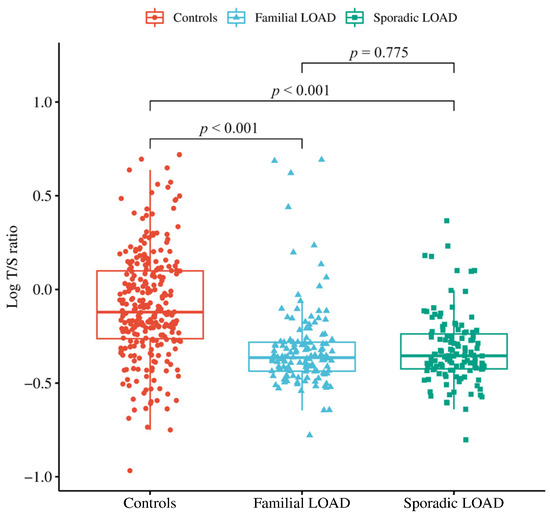 As shown in Figure 1, the mean log-transformed LTL (logT/S ratio) in controls (−0.089, standard error (SE) 0.016) was significantly higher than that in sLOAD patients (−0.32, SE 0.017; p < 0.001), a difference that equates to about 48% decrease in the T/S ratio. Similarly, the mean logT/S ratio in controls was significantly higher than in fLOAD patients (−0.32, SE 0.019; p < 0.001), a difference that equates to a 41% decrease in the T/S ratio. No difference was observed in mean LTL between the two groups of patients (p > 0.05).