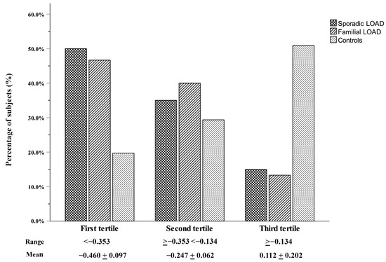 To better illustrate the telomere–LOAD relationship, the distribution of the logT/S ratio was categorized into tertiles constructed using the combined case–control group with the age adjustment carried out within the separate groups. The first tertile (ranging from −0.967 to −0.354, mean −0.46) represents the shortest telomeres, the second tertile (ranging from −0.353 to −0.137, mean −0.247) represents the medium, and the third tertile (ranging from—0.134 to 0.79, mean 0.112) represents the longest telomeres. Figure 2 shows the proportion of cases and controls across the three tertiles. As this figure shows, compared with controls, a significantly higher percentage of LOAD patients had telomeres in the first-tertile range, while, by contrast, a lower percentage of patients had telomeres in the third-tertile range (sex- and age-adjusted overall p-value < 0.001).