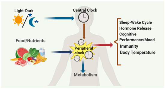 Circadian rhythm is an intrinsic time-keeping mechanism that exists in almost all organisms from bacteria to humans by synchronizing their biological processes with a nearly ~24 h day/night cycle. These biological oscillations help organisms adapt to daily environmental changes [1]. These self-sustaining biological oscillations can respond to environmental stimuli like temperature, nutrients, and light [2]. In mammals, many physiological processes are under circadian control, including sleep–wake cycles, feeding behavior, core body temperature, blood pressure, cognitive performance, glucose homeostasis, and various hormonal secretions. In mammals, circadian clocks are present in almost all cells and tissues, and the central control lies with the “master clock” in the suprachiasmatic nucleus (SCN) located within the brain’s hypothalamus. This master clock is the primary driver of circadian rhythms and is vital in synchronizing peripheral clocks found in various tissues like the liver, pancreas, skeletal muscle, intestine, and adipose. The peripheral clocks respond to internal signals influenced by nutrients and temperature, ensuring proper coordination of physiological processes throughout the body [3]. Maintaining a synchronized circadian rhythm is crucial for health [4]. The circadian rhythm regulates sleep–wake cycles, release of hormones, immunity, and body temperature. Given the significant impact of food-related cues on various biological processes, including circadian rhythm, it is not surprising that they play a prominent role in influencing these physiological processes (Figure 1) [3]. Additionally, the SCN, which serves as the central pacemaker for circadian rhythm, receives input from specialized light-sensitive intrinsically photosensitive retinal ganglion cells (ipRGCs) in the retina. These cells contain the photopigment and melanopsin and transmit light information to the SCN, helping to synchronize circadian rhythm with the external light–dark cycle [4]. Furthermore, circadian rhythms influence the expression of genes involved in neuronal activity and synaptic plasticity. Moreover, attention, memory, and reaction time are just a few cognitive abilities significantly influenced by circadian rhythms [5].