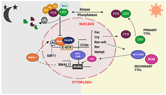 Critical advances in genetics revealed that the molecular clock in mammals is generated by TTFL, that drives 24 h rhythms of biological oscillations. In mammals, the core TTFL clock is driven by transcriptional activators/proteins, CLOCK and BMAL1, and repressor proteins, PERIOD (PER) and CRYPTOCHOME (CRY). During the active phase, CLOCK and BMAL1 form heterodimeric complex viz., CLOCK: BMAL1, which activates transcription of the PER and CRY genes and other clock-controlled output genes. PER and CRY are converted into proteins in the cytoplasm. PER and CRY proteins heterodimerize in the cytoplasm and translocate to the nucleus to interact with CLOCK: BMAL1, inhibiting further activation of transcription towards the end of the rest phase. PER and CRY proteins are degraded with time through ubiquitin-dependent pathways, and the corresponding repression on CLOCK: BMAL1 is relieved. This cycle begins again with a 24 h periodicity (Figure 2) [6]. Over a 24 h period, these positive and negative regulations cause the clock gene expression to cycle.