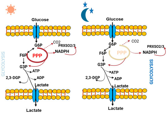 Some crucial metabolites which directly affect the circadian clock are better characterized. Notably, polyamines have recently been found to oscillate and provide feedback to the circadian clock system [21]. Polyamines, which have been observed to decrease with age, play significant and diverse roles within the cell. They can attach to DNA and proteins, controlling various functions from gene expression to ion channel operation. The circadian clock and feeding habits impact the rhythmicity in polyamine abundance [22]. Ornithine decarboxylase (ODC), the rate-limiting enzyme in polyamine production, experiences oscillations throughout the circadian cycle controlled by BMAL1: CLOCK trans-activation. It has been found that a longer circadian period is caused by polyamine depletion in cells and mice, principally because the PER2:CRY1 protein connection is compromised. Increasing polyamine concentration, however, has the reverse effect, and shortens the circadian period [21]. Additionally, considerable alterations were seen in urinary metabolites during sleep loss compared to regular sleep. Eight specific metabolites—taurine, formate, citrate, 3-indoxyl sulphate, carnitine, 3-hydroxyisobutyrate, TMAO, and acetate—showed increased levels, whereas eight additional metabolites—dimethylamine, 4-DTA, creatinine, ascorbate, 2-hydroxyisobutyrate, allantoin, 4-DEA, and 4-hydroxyphenylacetate—showed decreased levels in sleep deprived subjects [17]. In addition, the circadian metabolome and the rhythmic glycolysis and pentose phosphate pathway metabolites in human red blood cells highlight the essential role of cellular metabolism in their non-transcriptional circadian clocks. RBCs heavily depend on glycolysis pathway for ATP and pentose phosphate pathway for NADPH, which are crucial for redox balance and antioxidant protection. Throughout the circadian day time, the flux within the pentose phosphate pathway (PPP) achieves its peak while glycolysis operates at its lowest point. Conversely, glycolytic flux reaches its highest level at night, coinciding with the lowest PPP flux. The metabolic changes during these day and night cycles involve critical molecules such as Glucose-6-phosphate (G6P), Fructose-6-phosphate (F6P), Adenosine triphosphate (ATP), 2,3-Biphosphoglycerate (2,3-BPG), Glyceraldehyde-3-phosphate (G3P), Nicotinamide adenine dinucleotide phosphate reduced form (NADPH), and over-oxidized peroxiredoxin protein (PRDX-SO2/3) [23] (Figure 3).