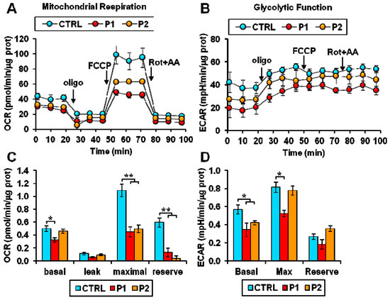 Altered energy metabolism in patient fibroblasts. (A,B) Representative Seahorse XF trace of oxygen consumption rate (OCR) (A) and extracellular acidification rate (ECAR) (B) performed in normal (CTRL) and Parkinson’s disease (PD) patient (P1, P2) fibroblasts. (C) Basal: resting OCR; leak: OCR measured in the presence of oligomycin; maximal: OCR measured in the presence of FCCP; reserve: difference between maximal and basal respiration. (D) Basal: resting ECAR; Max: ECAR measured in the presence of oligomycin and FCCP; Reserve: difference between maximal and basal glycolysis. * p < 0.01, ** p <0.005. Figure was adapted with permission of Pacelli et al. [41].