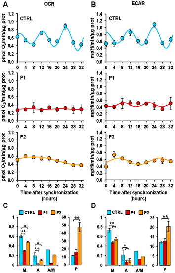 Altered mitochondrial respiratory and glycolytic activity in fibroblasts. (A) Resting oxygen consumption rate (OCR) and (B) basal extracellular acidification rate (ECAR) in serum shock-synchronized normal fibroblasts (CTRL) and PD patient-derived fibroblasts (P1, P2)—the time-course data points were best fitted with the COSINOR function. (C,D) The histograms display the mesor (M-x axis), the amplitude (A-x axis), and the A/M ratio (x-axis) for respiration (C) and glycolysis (D) of the best-fitting COSINOR. * p < 0.01, ** p < 0.005. Figure was adapted with permission of Pacelli et al. [41].