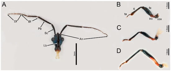 General morphology of head and legs of Ectrychotes andreae (A) head, (B) foreleg, (C) midleg, (D) hindleg. Abbreviations: An, antennae; Bf, basiflagellomere; cox, coxa; Df, distiflagellomere; fe, femur; Lb, labium; Pe, pedicel; Sc, scape; ta, tarsus; ti, tibia; tro, trochanter.