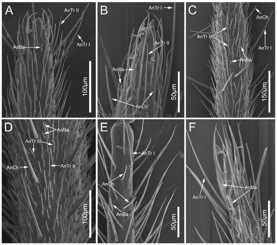 The antennal flagellum of the sampled reduviid species, showing the distribution of antennal sensilla trichodea, sensilla chaetica, and sensilla basiconica. (A) Ectrychotes andreae, (B) Haematoloecha limbata, (C) Labidocoris pectoralis, (D) Neozirta eidmanni, (E) Opistoplatys majusculas, and (F) Opistoplatys sp. Abbreviations: AnBa, antennal sensilla basiconica; AnCh, antennal sensilla chaeticaand; AnTr I–III, antennal sensilla trichodea I–III.