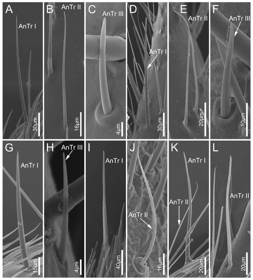 Antennal sensilla trichodea (AnTr) are hair-shaped structures with tapered tips. Three subtypes of AnTr can be distinguished among the sampled species. Antennal sensilla trichodea I (AnTr I) are long and broad, possessing flexible sockets (Figure 2 and Figure 3A,D,G,I,K). Antennal sensilla trichodea II (AnTr II) are shorter and slender than AnTr I (Figure 3B,E,J,K,L) and have inflexible sockets. The socket of AnTr II of N. eidmanni is located in a cavity with raised edges (Figure 3J). Antennal sensilla trichodea III (AnTr III) with flexible sockets are the shortest trichodea (Figure 3C,F,H). In all sampled species, AnTr are located on all the antennal segments.